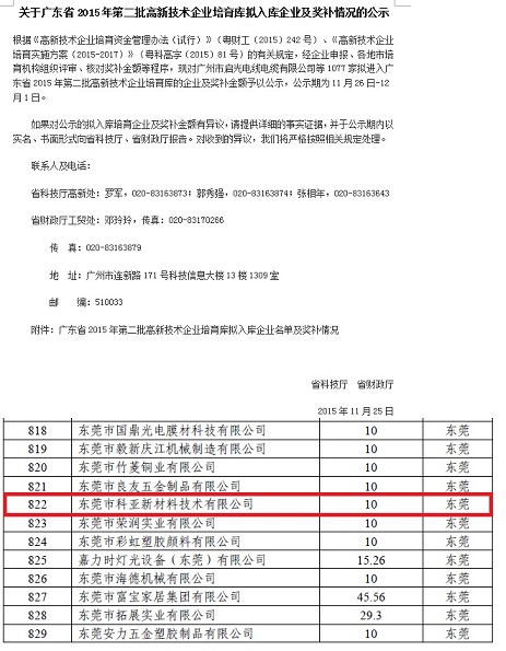 科亞新材料榮獲廣東省2015年第二批高新技術(shù)企業(yè)培育入庫獎(jiǎng)勵(lì)補(bǔ)助