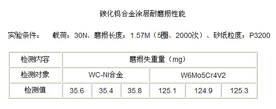 碳化鎢合金螺紋元件性能和常規(guī)W6Mo5Cr4V2高速工具鋼螺紋元件中比較;在同等工況條件下耐磨耐腐蝕壽命可提高3.5倍以上。現(xiàn)將廣州有色金屬研究院新材料研究對產(chǎn)品耐磨性能實(shí)驗(yàn)結(jié)果列表對比如下: